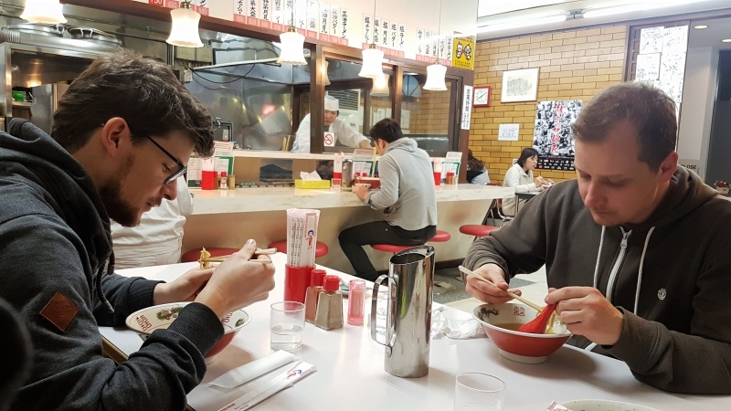 Inzwischen war es ungefähr 11.00 Uhr und wir machten uns auf den Weg nach Asahikawa – unserem ersten Unterkunftsort. Nachdem wir überall gelesen hatten, dass die japanischen Autobahnen aus Kostengründen zu meiden sind, hielten wir uns an die Landstraßen. Allerdings haben japanischen Landstraßen eine Geschwindigskeitsbeschränkung von 50 km/h, so dass wir mindestens 3 Stunden gebraucht haben, um 140 km zu fahren. Die geplanten 2 Stunden auf der Piste sind der Geschwindigskeitsbeschränkung zum Opfer gefallen. Nachdem wir die erste AirBnb-Wohnung nach einiger Sucherei gefunden hatten, machten wir mittels TripAdvisor auf der Suche nach einer Möglichkeit zum Abendessen. Wir wurden fündig bei einem traditionellen japanischen Ramen-Imbiss. Haris wurde auf die Probe gestellt mit Stäbchen seine Ramen-Suppe zu essen ;-)!